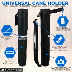Many people require an additional walking aid when dismounted from their scooter or power chair. Our universal cane holder for mobility scooters and power chairs from AlveyTech allows the user to bring their cane along for the ride without it getting in their way or falling out. This high-quality mobility accessory will easily become one of the most useful add-ons for any mobility scooter, electric power chair, or manual wheelchair, hence its universal application. The AlveyTech universal cane holder quickly attaches to the backrest of your chair with an included adjustable nylon strap. Canes up to 2-3/4″ in diameter may be carried in this very handy and convenient ripstop fabric pouch.