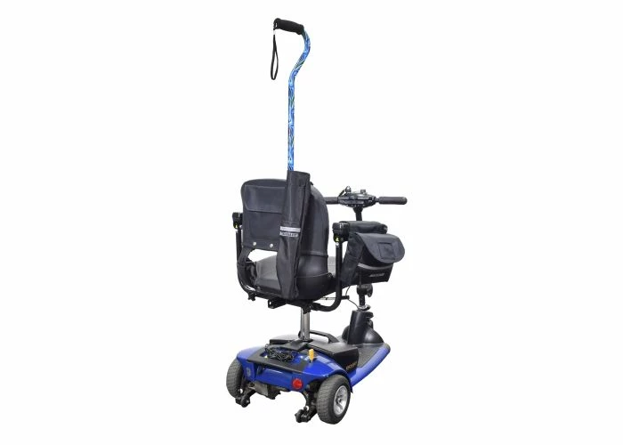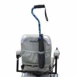 Many people require an additional walking aid when dismounted from their scooter or power chair. Our universal cane holder for mobility scooters and power chairs from AlveyTech allows the user to bring their cane along for the ride without it getting in their way or falling out. This high-quality mobility accessory will easily become one of the most useful add-ons for any mobility scooter, electric power chair, or manual wheelchair, hence its universal application. The AlveyTech universal cane holder quickly attaches to the backrest of your chair with an included adjustable nylon strap. Canes up to 2-3/4″ in diameter may be carried in this very handy and convenient ripstop fabric pouch.