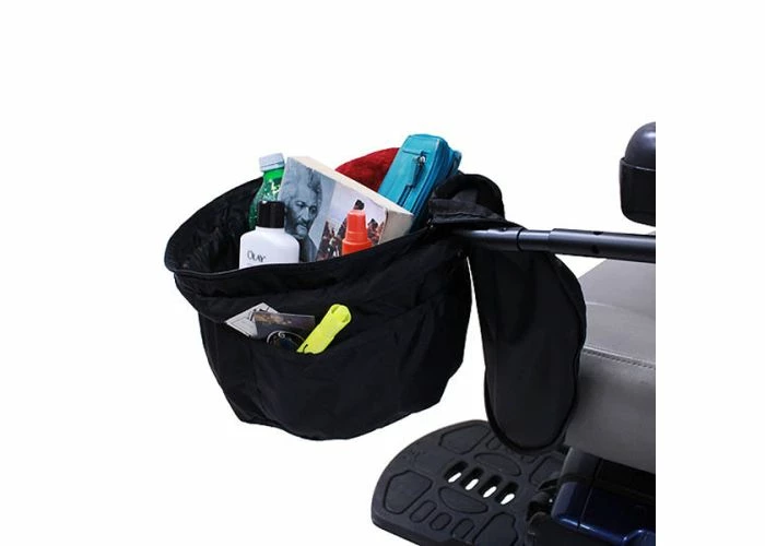 A very convenient feature of this front bag is its universal mount system. If your mobility scooter, power chair or wheelchair has armrests, then this will easily fit. Just wrap the holder’s straps around the armrest, snug them down, and attach the bag’s mounting arm. It really is that simple, and doesn’t take much more time to do it than takes to tell about it.