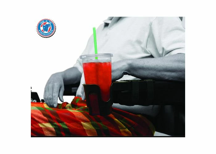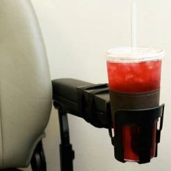 A copious amount of thought went into the design of this scooter cup holder. Not only does it mount securely on a myriad of armrest types; the basket is made to hold everything from big bottled drinks to odd sized coffee mugs. Slots on either side allow the mug handles of your favorite drink to slip right on down without hanging up on the rim. The Nearly Universal Cup Holder comes with two Velcro straps as well as a pair of stick-on foam pads to allow you to get a firm grip.