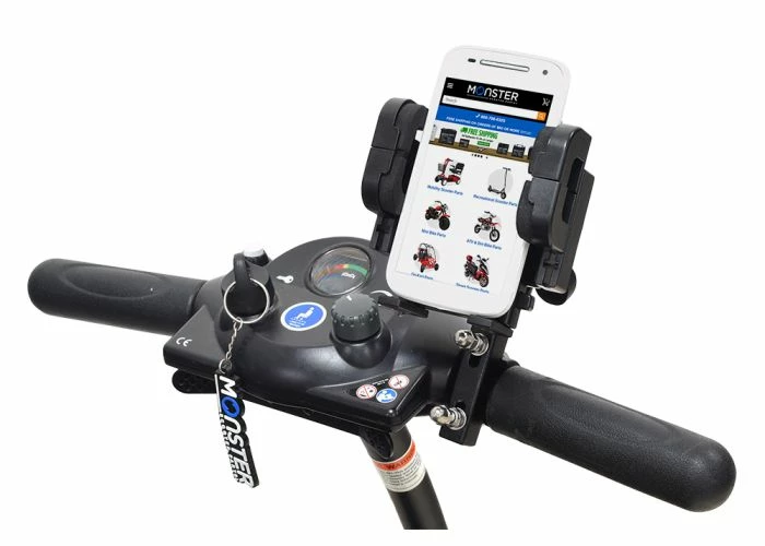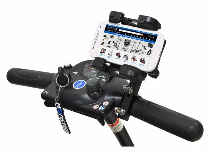 This high quality black holder really grabs your electronic device with its adjustable “wings” that can slid in or out, and then locked down tight and secure. There is a protective foam pad to ensure your cellphone or iPod doesn’t get bumped and rattled all around. And best of all; it will quickly mount on just about any and every handlebar, or armrest bracket used on scooters, wheelchairs and power chairs today. With the holder’s universal mounting setup, it is perfect for all the top brands, such as ActiveCare, Go-Go, Jazzy, Invacare, Merits, Pride Mobility, Shoprider, and Rascal scooters and power chairs just to name a few.