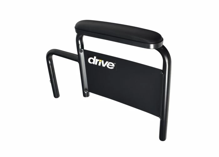 The left-side desk length armrest assembly for Drive Medical Silver Sport manual wheelchairs is offered as the complete unit; the armrest frame of strong steel tubing topped off with a soft upholstered desk-length armest pad