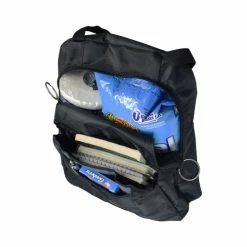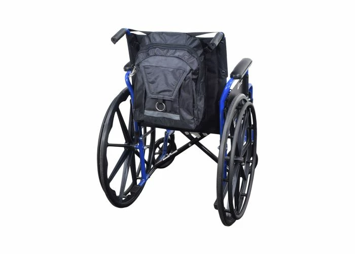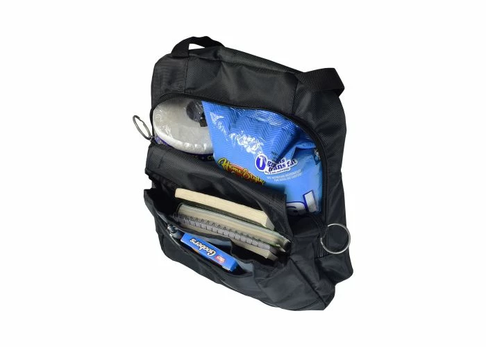 The 17″x14″ backpack for wheelchairs features six copious storage areas for your take-along stuff, adjustable straps, and easy to pull “O” rings on the end of the flaps and zippers
