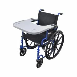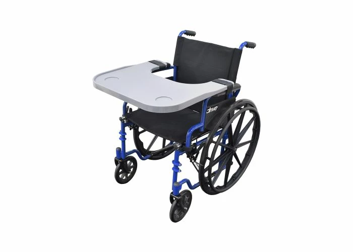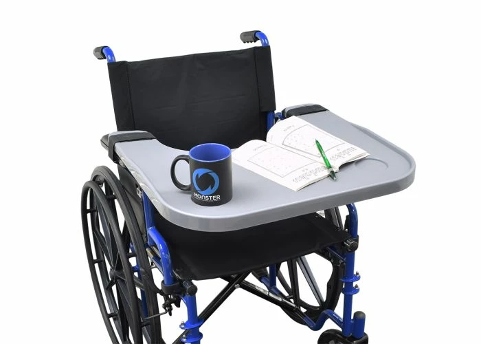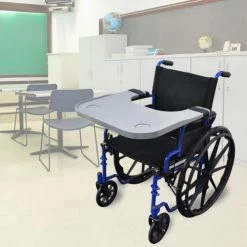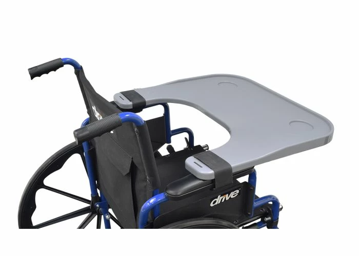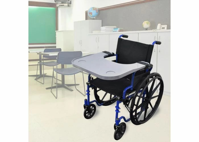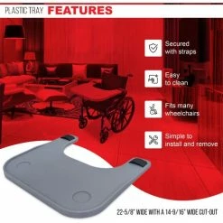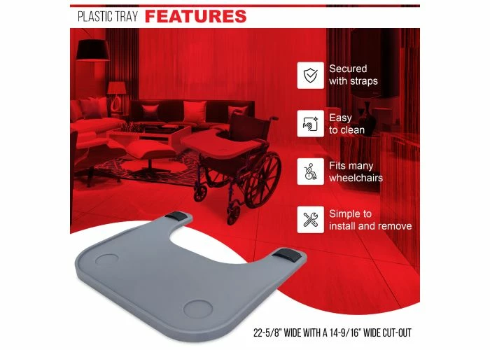 Our plastic tray table for wheelchairs is made of strong and stiff ABS, and is secured to the chair’s armrests with straps