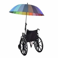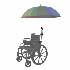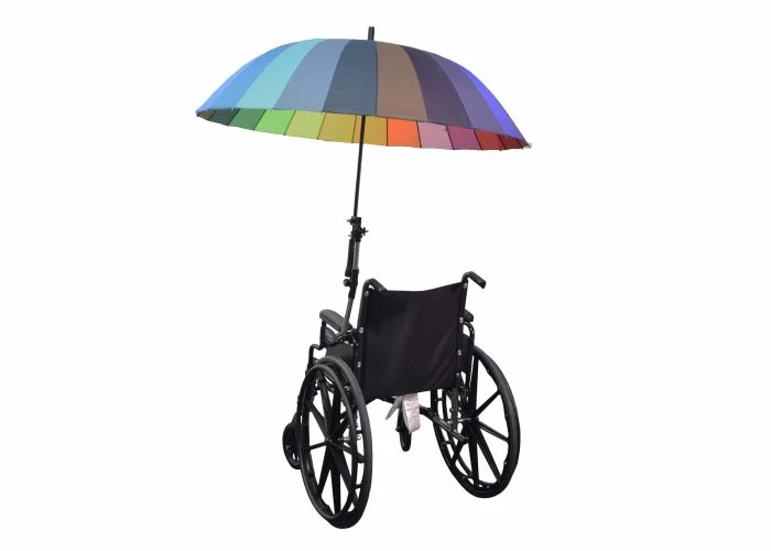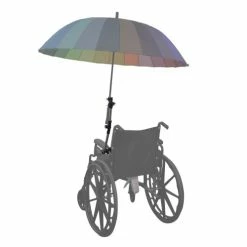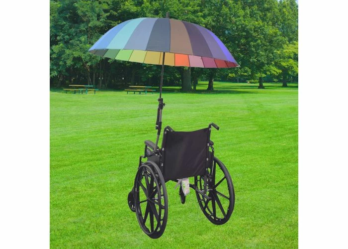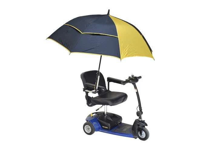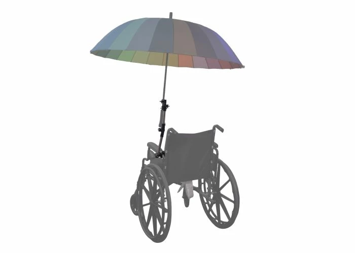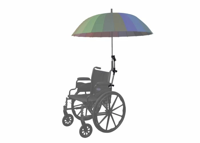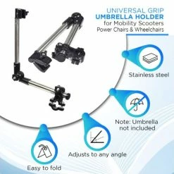 Quickly and easily attaches with a simple base clamp to any scooter, power chair, wheelchair, stroller, walker, or deck chair. Plus, the flexible arm allows you to position your umbrella to just the angle that will do the most good.