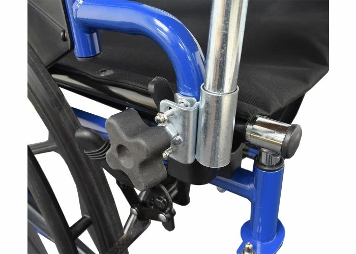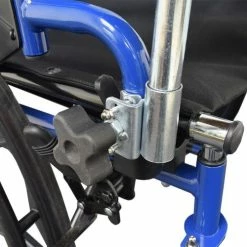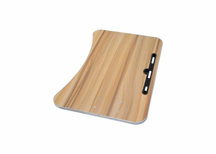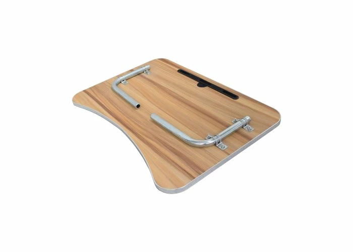 Our wood veneer tray table for wheelchairs is certainly a handy and convenient mobility accessory. Overlayed with a handsome woodgrain style laminate bearing a slightly pebbled textured surface, the tray table sports two folding steel supports on the underside. The table is held to the wheelchair’s frame by a set of two mounting clamps with big and easy to turn adjustment knobs.